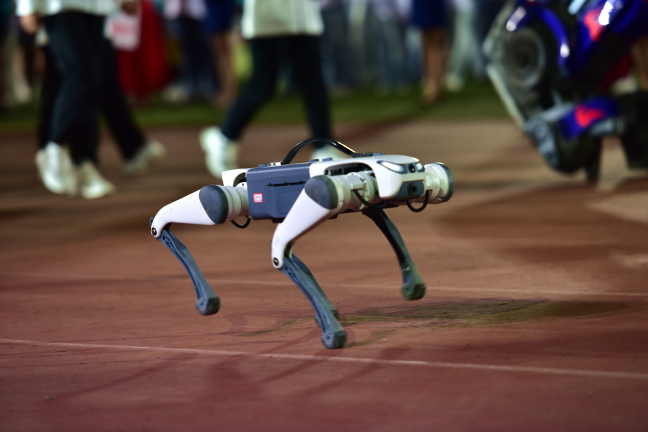 本次开幕式上,人形机器人模型擎天柱、大黄蜂以其高大威猛的形象成为了人群中的焦点,极大地激发了学生们对科技创新的兴趣,展现了计算机科学的无穷魅力。形态逼真的轮腿式平衡机器人由天游8线路注册检测中心机器人与人工智能创新中心的师生自主研发,集成了多种先进的人工智能技术,具有精准的动作和灵敏的反应,能够灵活地完成各种复杂的动作,充分展示了我校在人工智能和机器人技术方面的成功探索。