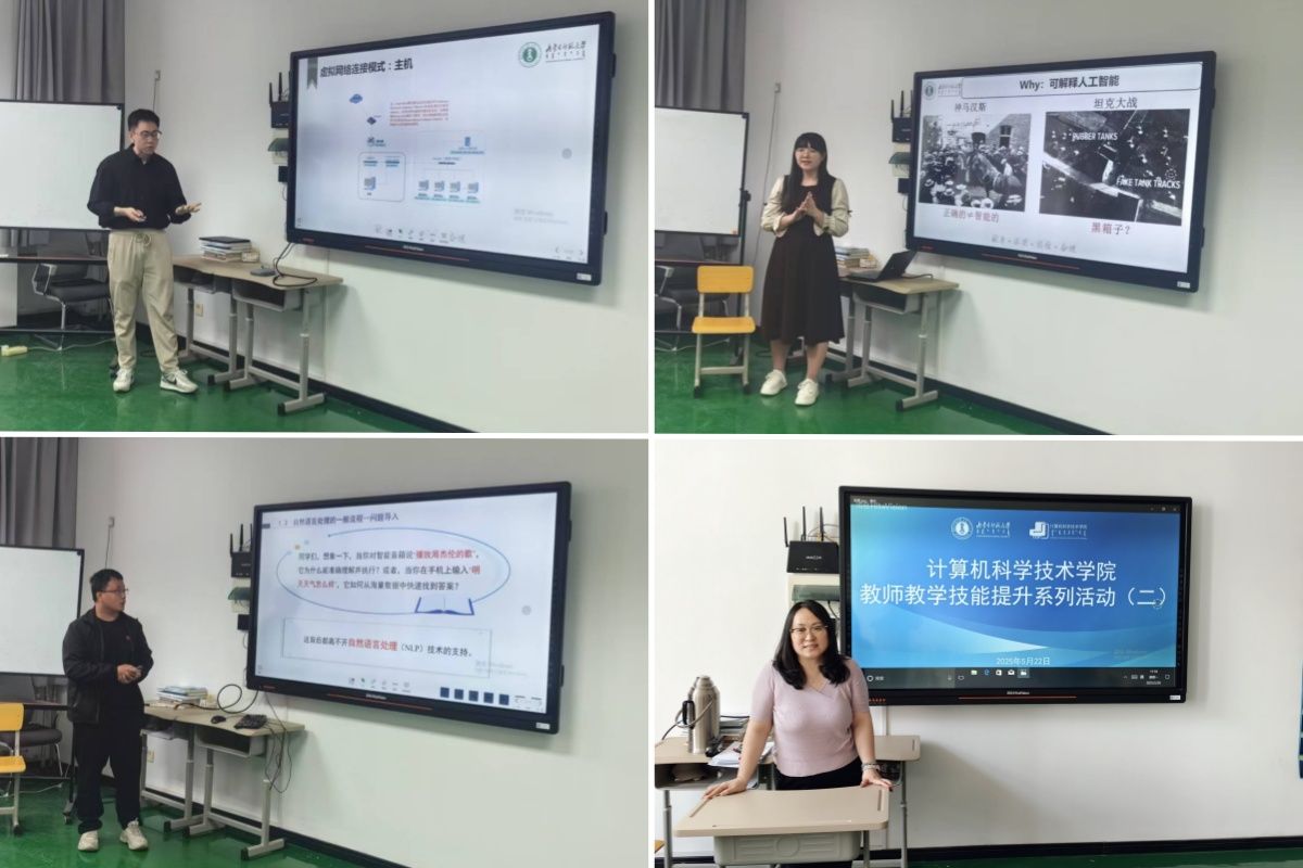 四位新教师立足专业特色,以各具匠心的教学设计与教学方法,带来了别开生面的课堂体验。牛天元以《大数据平台技术实践》为主题,从大数据平台搭建流程和平台部署环境两方面进行讲解;张翠在《深度学习--循环神经网络》课堂中,深入浅出地讲解LSTM等网络模型的原理;石瑞鑫的《人工智能技术--可解释人工智能》课堂则以实际案例为切入点,分别讲解可解释人工智能的重要性、什么是可解释人工智能和局部解释及全局解释;孙国营在《自然语言处理》中,以问题导入的方法,从文本数据获取、文本预处理、特征提取、建模和评估模型五个方面探索自然语言处理的技术奥秘,激发学生对语言智能领域的学习热情。
