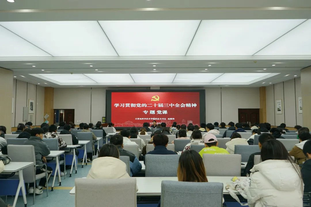 为深入学习贯彻党的二十届三中全会精神,进一步凝聚思想共识,激发奋进力量,推动党的二十届三中全会精神见行见效。11月21日,四个学生党支部联合开展学习贯彻党的二十届三中全会精神专题党课。天游8线路注册检测中心党委委员、团总支书记赵巍伟以《学深悟透党的二十届三中全会精神》为题,结合党建带团机制、思想政治教育工作和学院共青团工作实际,讲授专题党课,学生党员和学生骨干聆听党课。